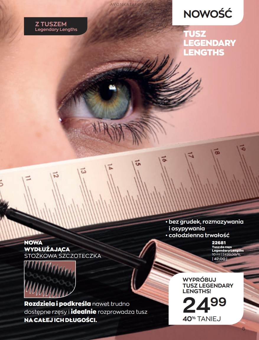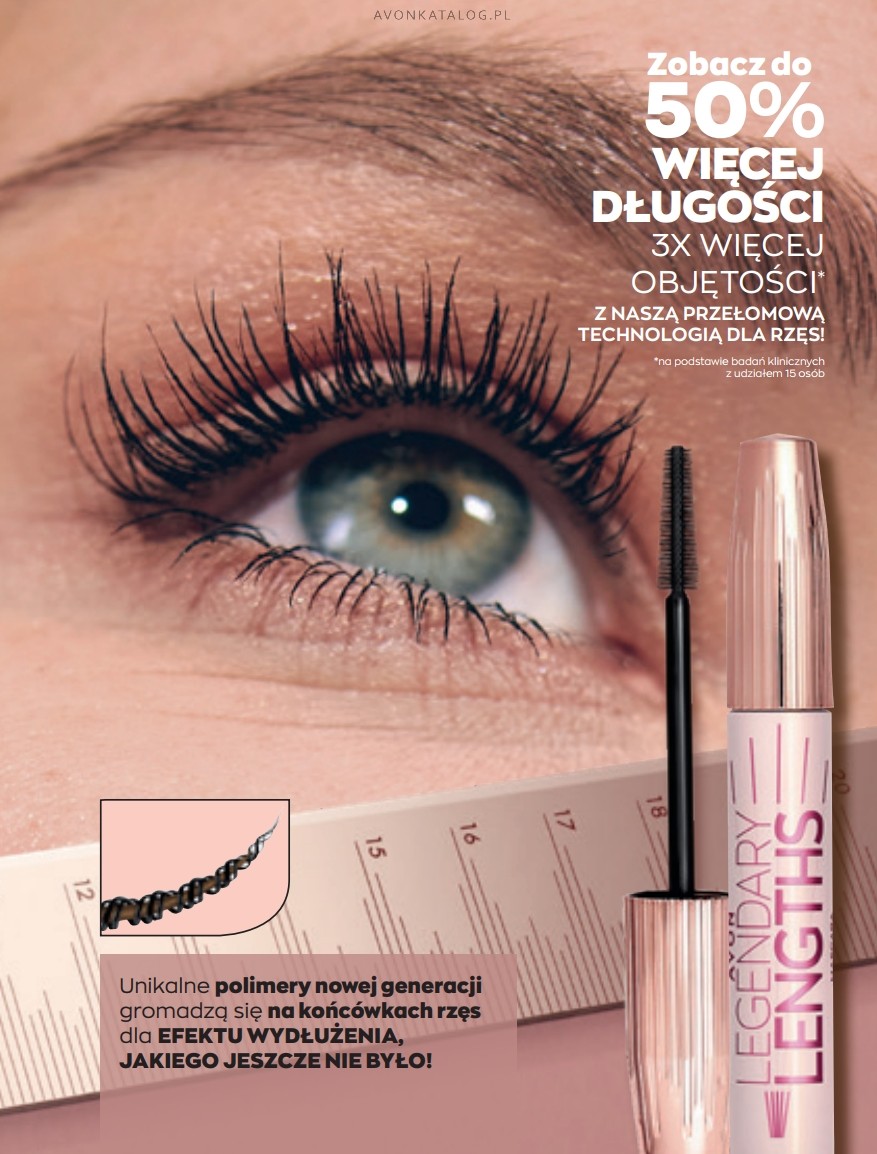 Okres obowiązywania katalogu 3/2022 rozpocznie się 1, a zakończy 31 marca 2022 roku. Marcowa kampania bardziej niż zwykle zainteresuje fanki długich i pogrubionych rzęs. W tej edycji sama okładka zdradza, która nowość jest najważniejsza. Jest nią pogrubiająco-wydłużający tusz do rzęs Legendary Lengths. Tusz rozprowadza się równomiernie po rzęsach. Precyzyjna szczoteczka rozdziela i podkreśla nawet trudno dostępne rzęsy.