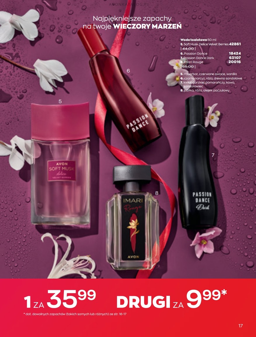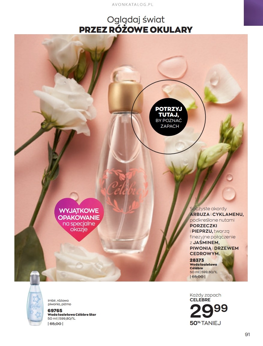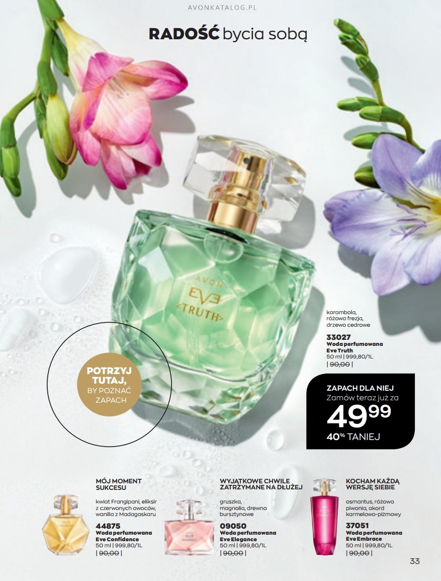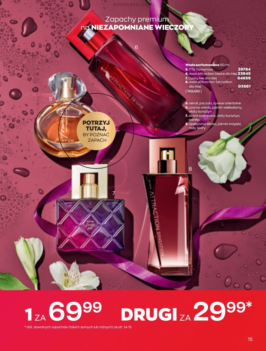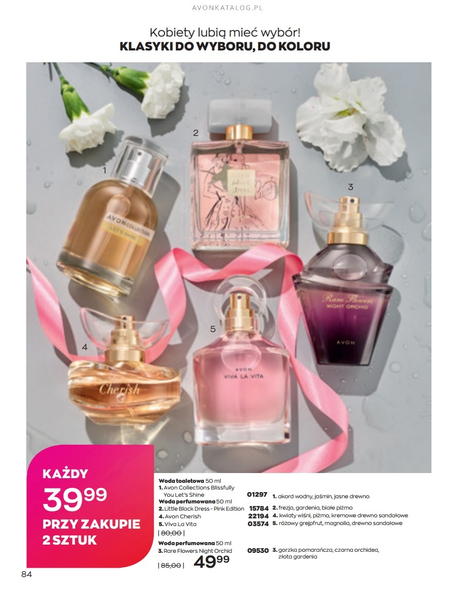 Promocja: Wybrane zapachy dla kobiet taniej przy zakupie 2 sztuk. Z tą ofertą promocyjną możesz zapoznać się na stronach 84-85. Strona 84 przedstawia zapachy dla kobiet o pojemności 50 ml w cenie 39,99 zł każdy. Ze strony 85 zamówisz zapachy o pojemności 30 ml w cenie 29,99 zł każdy. Możesz zamówić dla siebie dwa ulubione zapachy lub kupić jeden dla siebie, a drugi dla bliskiej Ci osoby. Możesz też dogadać się z przyjacielem lub przyjaciółką i podzielić się zamówieniem.