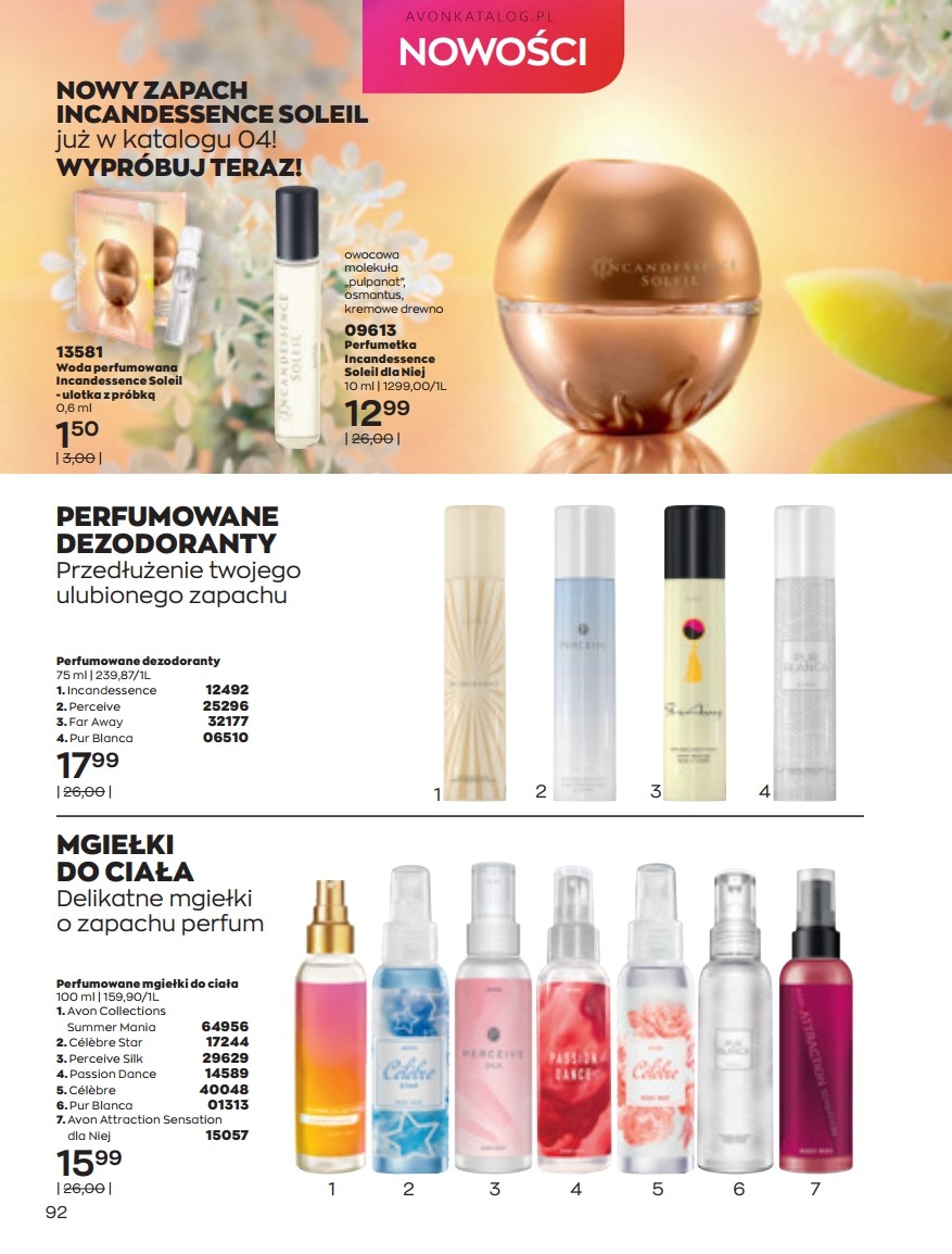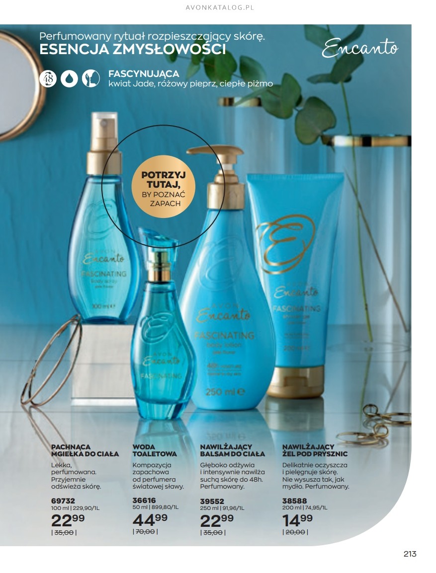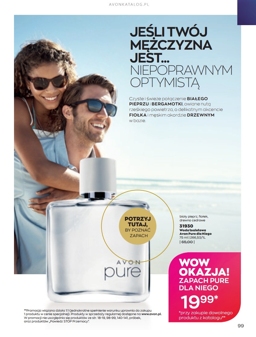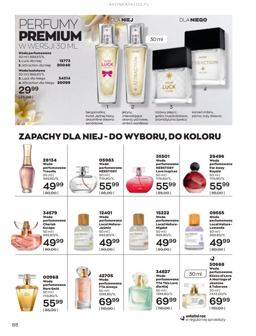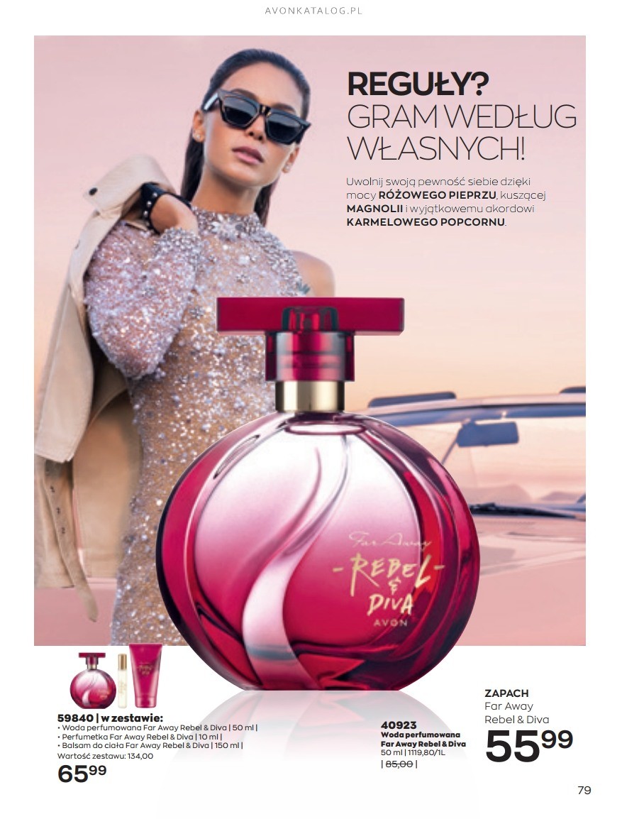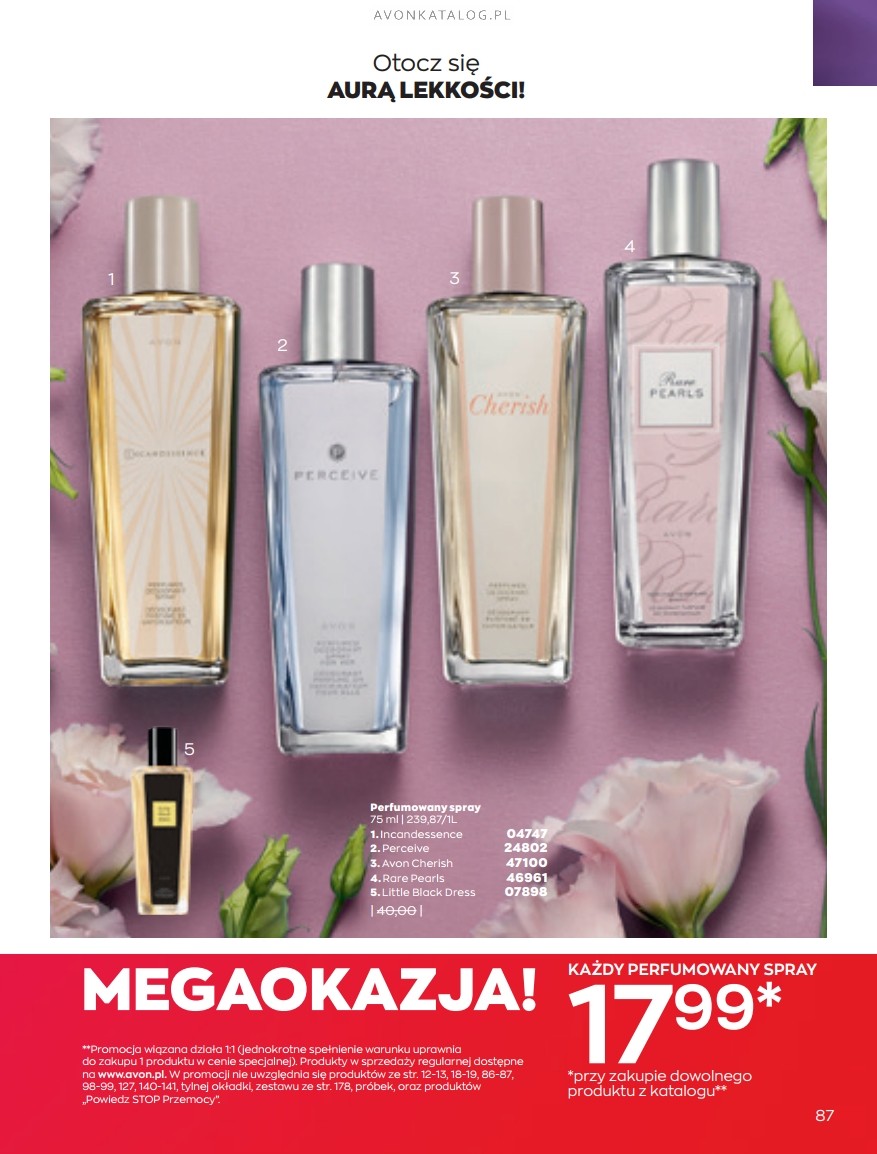 Promocja: Wybrane zapachy dla kobiet taniej przy zakupie 2 sztuk. Z tą ofertą promocyjną możesz zapoznać się na stronach 84-85. Strona 84 przedstawia zapachy dla kobiet o pojemności 50 ml w cenie 39,99 zł każdy. Ze strony 85 zamówisz zapachy o pojemności 30 ml w cenie 29,99 zł każdy. Możesz zamówić dla siebie dwa ulubione zapachy lub kupić jeden dla siebie, a drugi dla bliskiej Ci osoby. Możesz też dogadać się z przyjacielem lub przyjaciółką i podzielić się zamówieniem.
