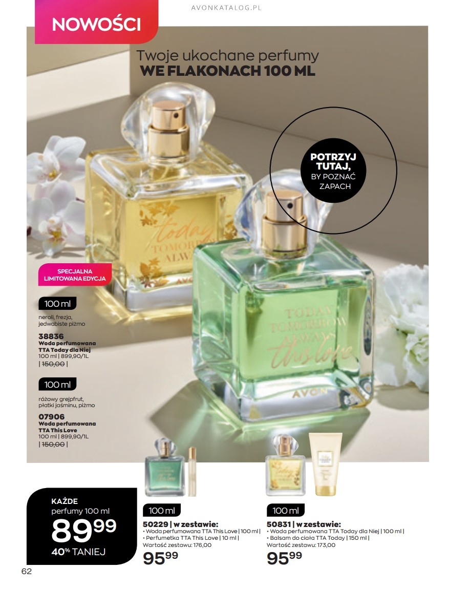 Nowość: Wielbicielki zapachów TTA Today oraz TTA This Love może zainteresować informacja, że te wody perfumowane dostępne będą w limitowanej edycji we flakonach o pojemności 100 ml. Taki flakon 100 mililitrowy kosztuje 89,99 zł. Więcej o ofercie dowiesz się na stronie 62.
