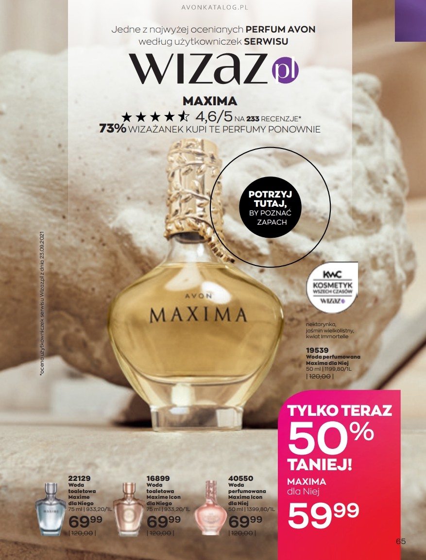 Promocja: Woda perfumowana dla kobiet Maxima dla Niej dostępna jest w cenie obniżonej o 50%. Zapach o pojemności 50 ml kosztuje 59,99 zł. Warto dodać, że to zapach dobrze oceniany przez klientki Avon. W serwisie wizaż.pl, Maxima dla Niej uzyskała ocena 4,6/5 na ponad 230 głosów. W ceneo, ocen tej wody perfumowanej jest mniej, ale są również wysokie, 4,8/5. Zainteresowana ofertą? Przejdź do strony 65.