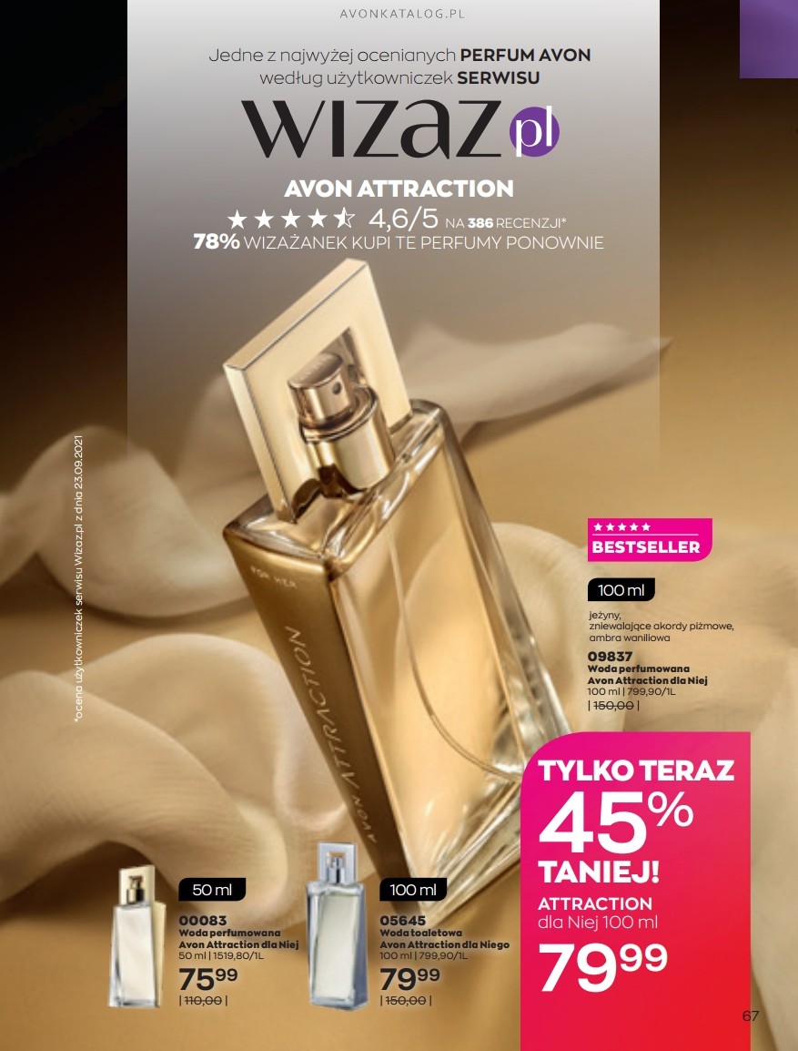 Promocja: Podobna promocja jak w przypadku Maximy, dotyczy zapachu Attraction dla Niej. Ta woda perfumowana dla kobiet, może być Twoja za 79,99 zł. Podobnie jak Maxima, również i Attraction dla Niej ma wysokie oceny, 4,6/5. W zapachu poczujesz nuty jeżyn, ambra waniliowa oraz akordy piżmowe.