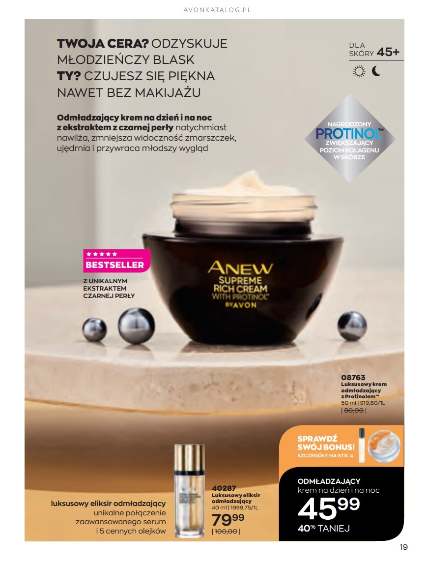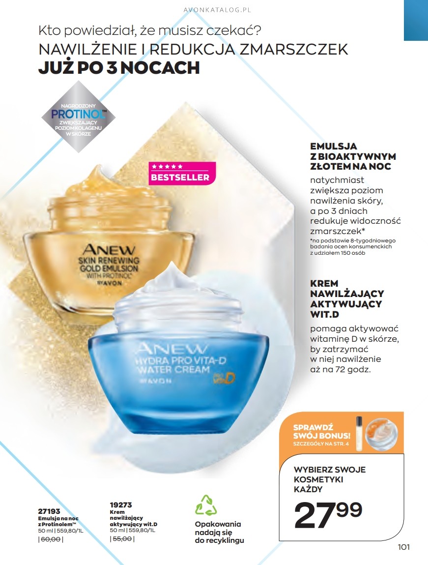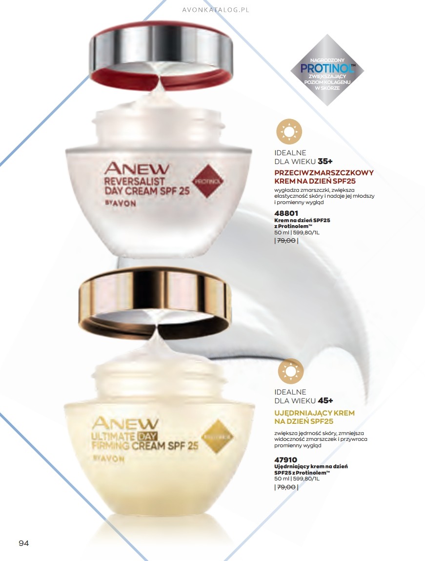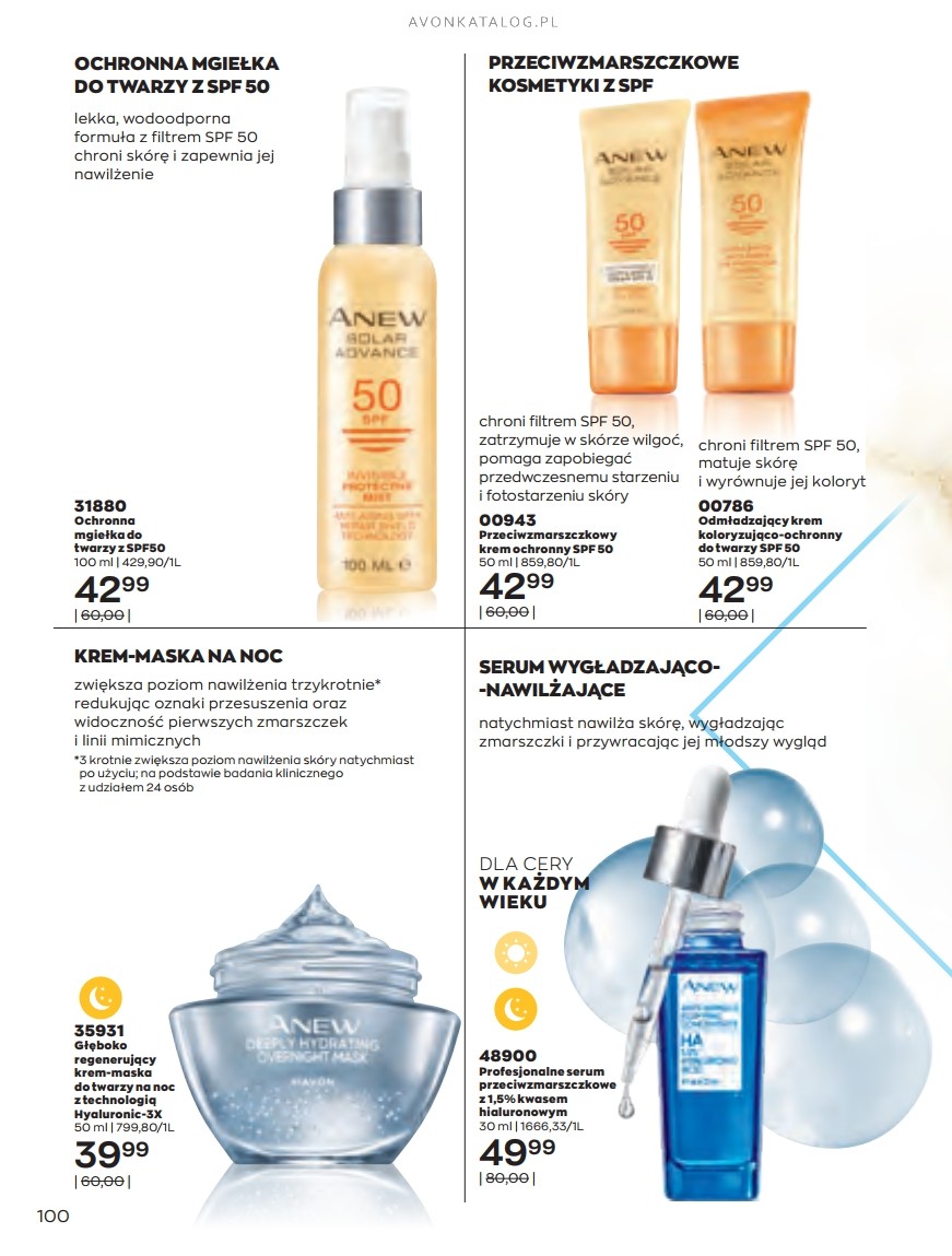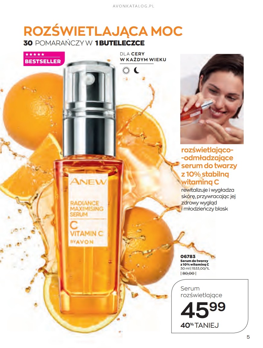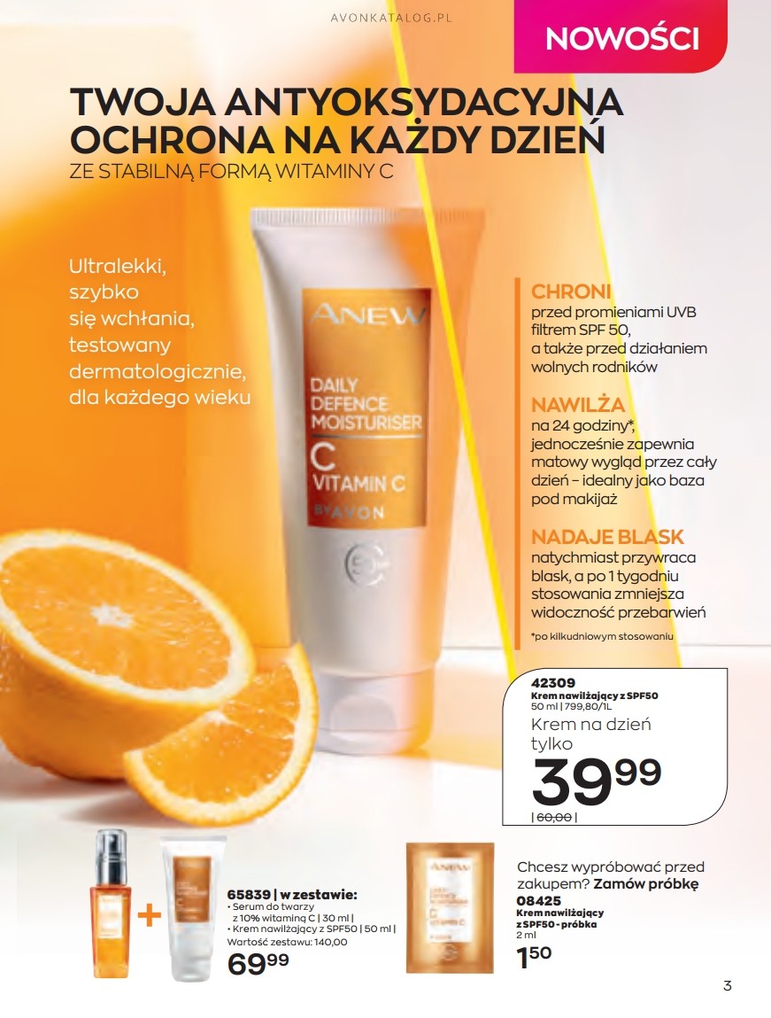 Nowość: W serii kosmetyków Anew pojawił się krem nawilżający z witaminą C i filtrem SPF50. Witamina C ogranicza działanie szkodliwych wolnych rodników, a filtr SPF50 pomaga chronić przed szkodliwym promieniowaniem UVA/UVB. Krem nawilża cerę i utrzymuje jej matowy wygląd przez cały dzień. Nadaje się jako baza pod makijaż. Krótko po użyciu przywraca skórze blask, a przy regularnym stosowaniu zmniejsza widoczność przebarwień. Dostępny jest do zamówienia jako osobny produkt lub w zestawie z innymi produktami Anew z witaminą C: rozświetlający tonik do twarzy oraz serum do twarzy z 10% witaminą C.