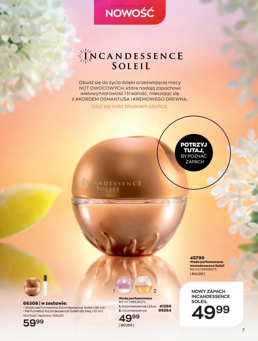 Nowość: Kolekcja zapachów dla kobiet Incandessence powięszyła się o wodę perfumowaną Soleil. W zapachu Soleil głównymi nutami zapachowymi są: cytrusy, osmantus i kremowe drewno.